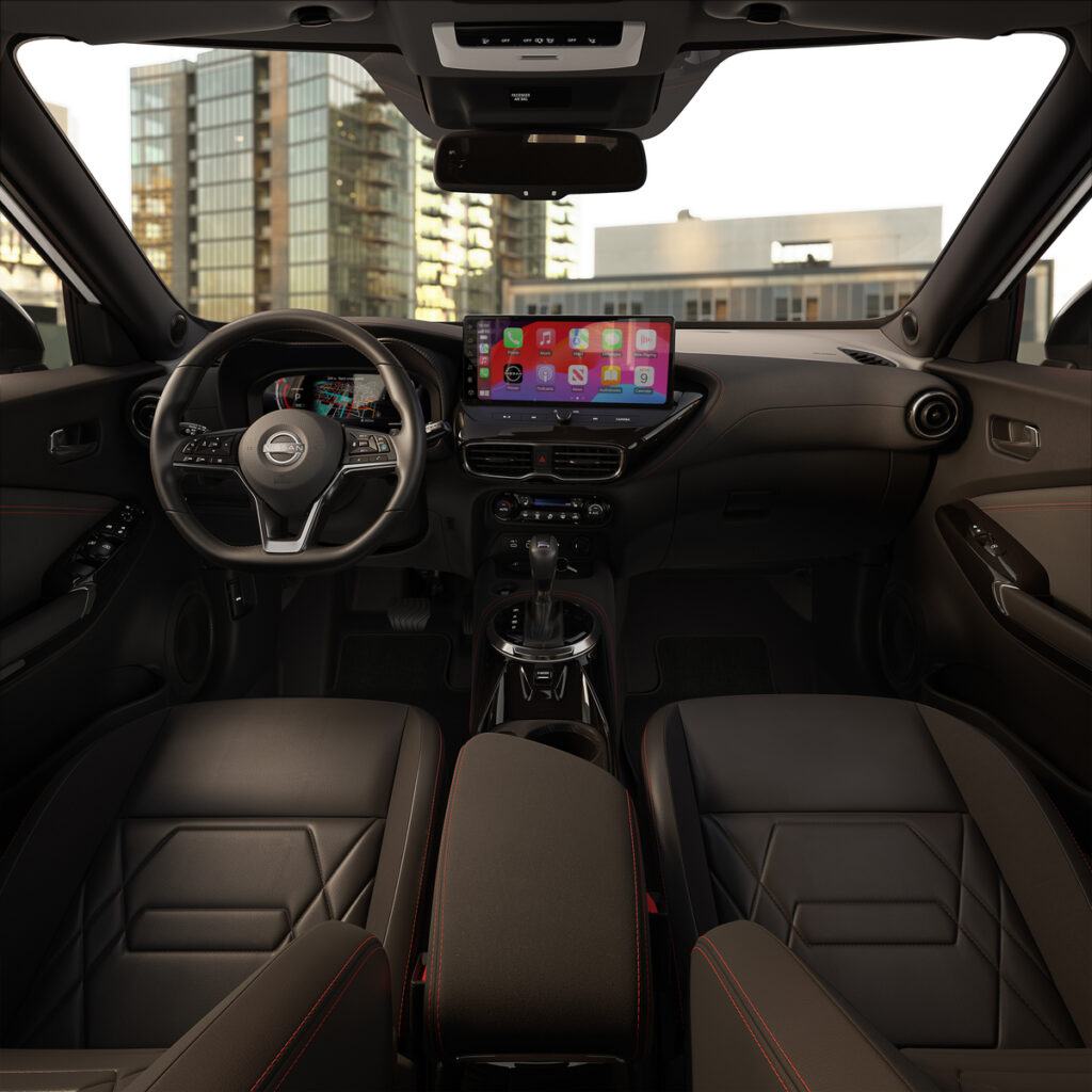 Kabina Nissana Juke Shiro łączy komfort z nowoczesnym wykończeniem i wysokiej jakości materiałami. Ciemną kolorystykę wnętrza przełamano elementami z Alcantary oraz czerwonymi przeszyciami, które pojawiają się na fotelach, konsoli środkowej, boczkach drzwi i miękkim obiciu deski rozdzielczej.