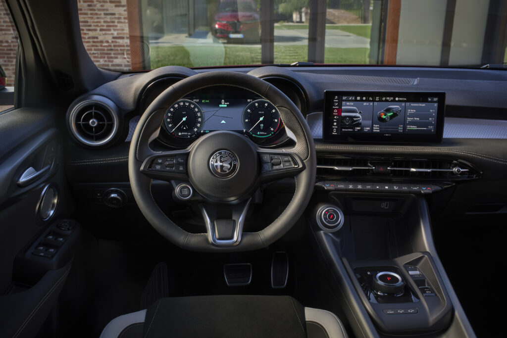 Pod maską pracuje układ miękkiej hybrydy 1.5, gdzie silnik benzynowy wspomagany jest niewielkim silnikiem elektrycznym. W praktyce oznacza to płynniejsze ruszanie, lepszą reakcję w mieście, niższe zużycie paliwa i kulturę pracy, z którą wcześniej w Alfie bywało różnie. To rozwiązanie nowoczesne, dopracowane i w pełni konkurencyjne, wobec tego, co oferują niemieckie czy japońskie marki. Tyle że tutaj wszystko podane jest z włoską oszczędnością.