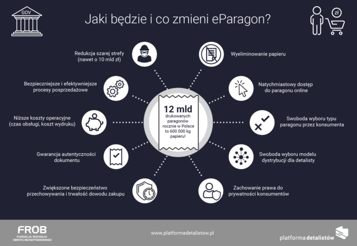Rządowy projekt umocowania prawnego eParagonu to rozwiązanie, które spełnia wymagania wielu sektorów i realizuje spójną politykę cyfryzacji państwa. Wprowadzenie eParagonu wpłynie korzystnie na ograniczenie tzw. „szarej strefy”, która, jak szacuje Fundacja Rozwoju Obrotu Bezgotówkowego, powoduje straty budżetu państwa na poziomie 5-10 mld zł rocznie.