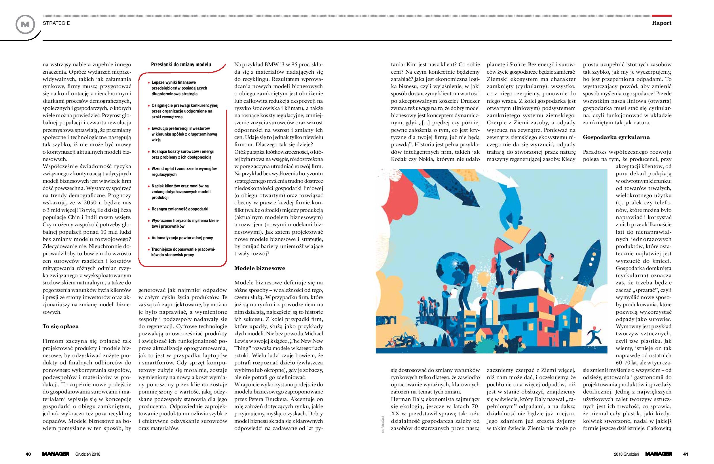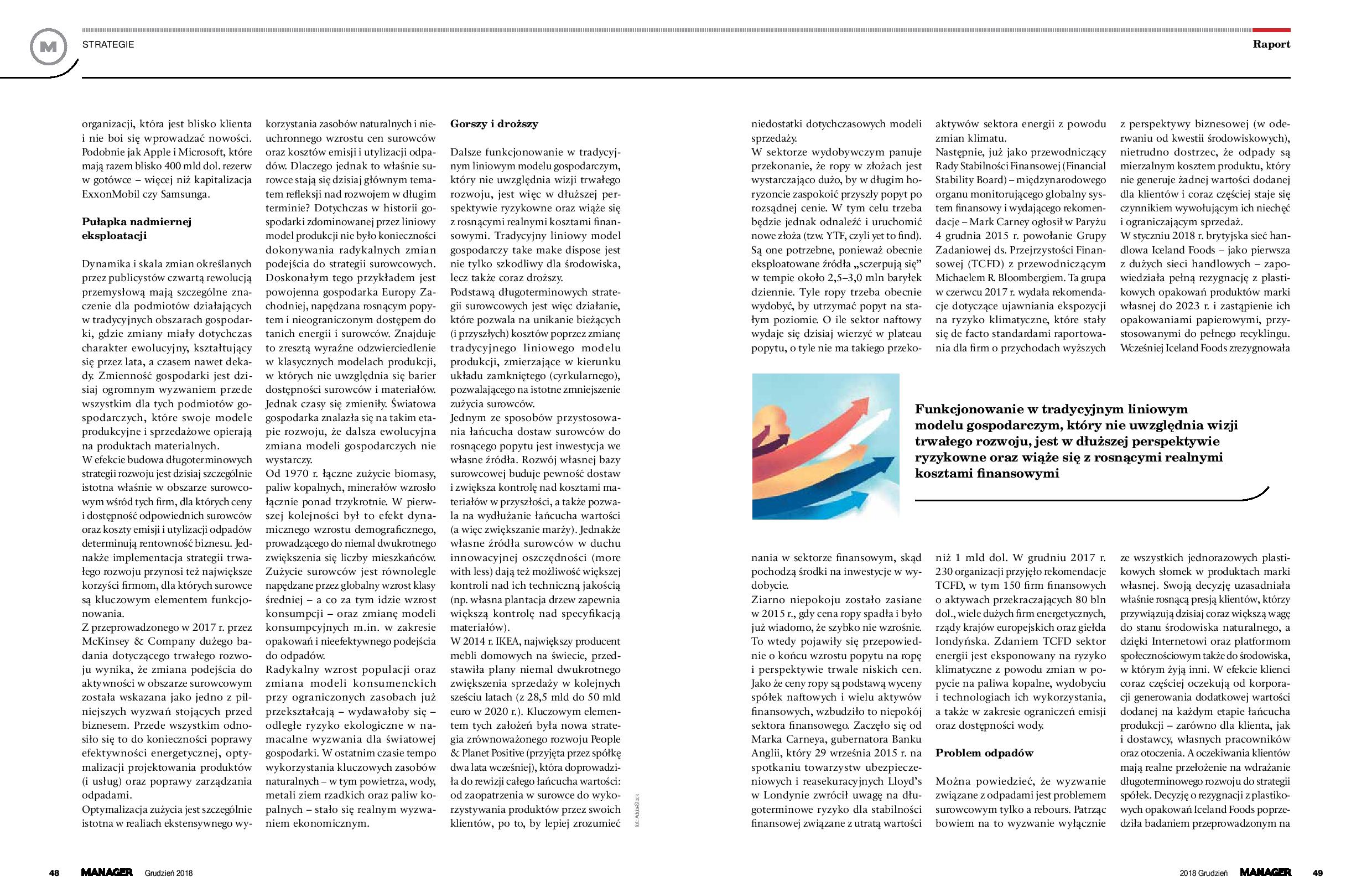 Od 1970 r., a więc przez ostatnie pół wieku, roczne zużycie podstawowych surowców wzrosło łącznie ponad trzykrotnie. Tak duże tempo wykorzystania kluczowych zasobów naturalnych jest dzisiaj już nie tylko problemem środowiskowym, lecz przede wszystkim realnym wyzwaniem ekonomicznym. Duże wzrosty cen surowców i rosnące problemy z ich dostępnością (np. kobaltu wykorzystywanego w produkcji baterii litowo-jonowych) sprawiają, że dla wielu firm zmiana podejścia do aktywności w obszarze surowcowym jest jednym z pilniejszych wyzwań w zakresie długoterminowego rozwoju. Nie chodzi jednak w tym przypadku wyłącznie o ograniczoną podaż i wysokie ceny materiałów. Klienci coraz częściej oczekują od korporacji generowania dodatkowej wartości dodanej na każdym etapie łańcucha produkcji, a inwestorzy, dostrzegając ryzyko w kontynuacji dotychczasowego modelu biznesowego w układzie liniowym, nie chcą angażować się w przedsięwzięcia nieuwzględniające problemu nadmiernego zużycia surowców (czego przejawem może być np. głośna decyzja dużego banku o wycofaniu się z inwestycji w energetykę węglową). Nowe podejście do kwestii surowcowych należy więc traktować nie jako CSR czy PR, ale konkretną inwestycję biznesową. Dalsza bezrefleksyjna aktywność w modelu liniowym wygeneruje w dłuższej perspektywie zbyt duże koszty finansowe, by inwestorzy nastawieni na długoterminowy zysk chcieli finansować tego typu przedsięwzięcia.