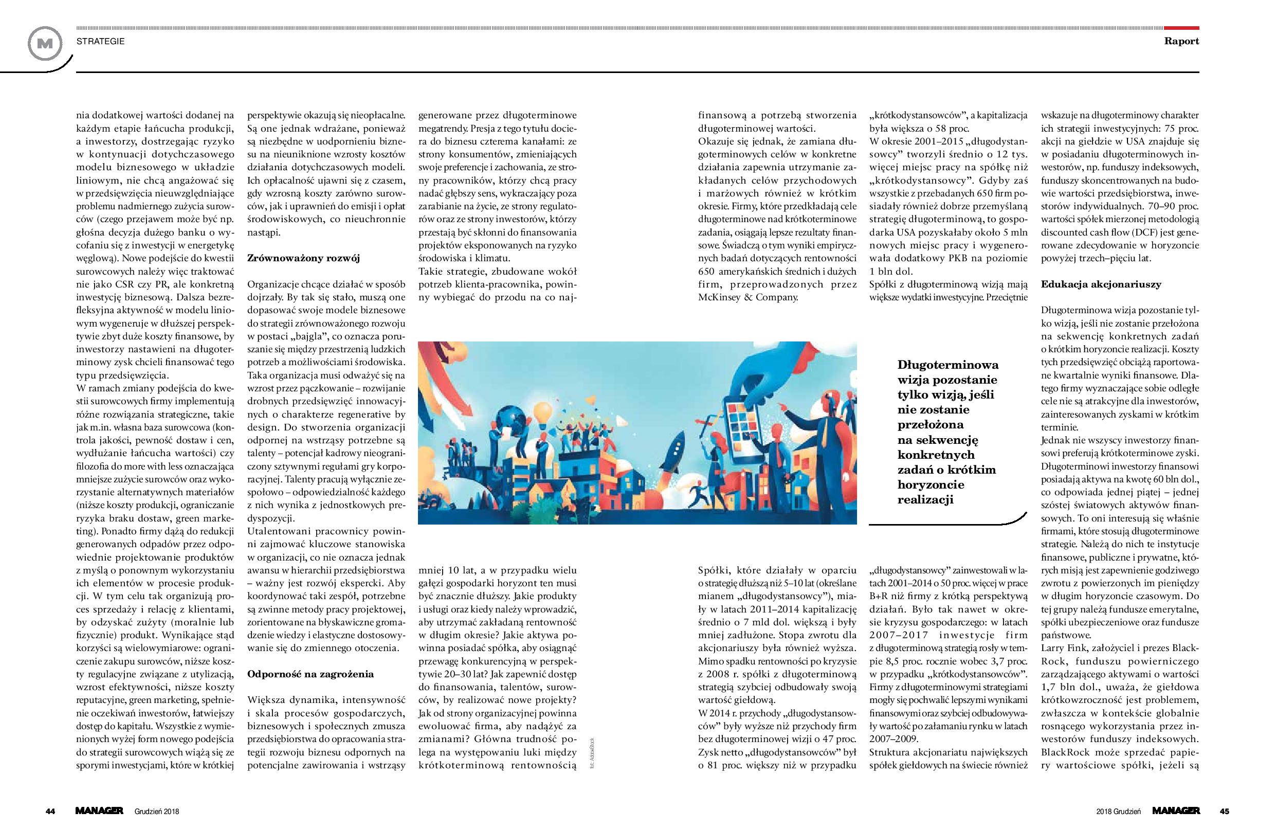 Spółki, które działały w oparciu o strategię dłuższą niż 5–10 lat (określane mianem „długodystansowcy”), miały w latach 2011–2014 kapitalizację średnio o 7 mld dol. większą i były mniej zadłużone. Stopa zwrotu dla akcjonariuszy była również wyższa. Mimo spadku rentowności po kryzysie z 2008 r. spółki z długoterminową strategią szybciej odbudowały swoją wartość giełdową.