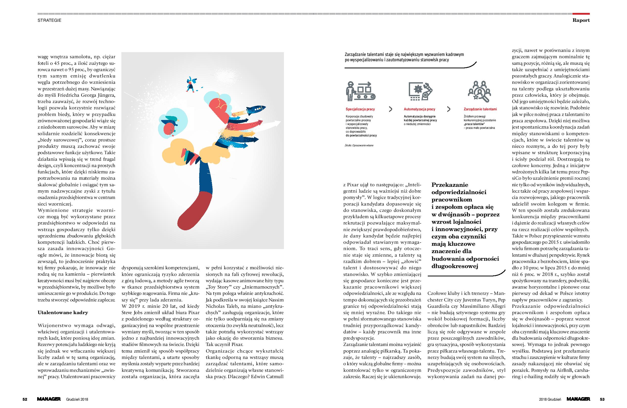 Zarządzanie talentami można wyjaśnić poprzez analogię piłkarską. Ta pokazuje, że talenty – najrzadszy zasób, o który walczą globalne firmy – można kontrolować tylko w ograniczonym zakresie. Raczej się je ukierunkowuje. Czołowe kluby i ich trenerzy – Manchester City czy Juventus Turyn, Pep Guardiola czy Massimiliano Allegri – nie budują sztywnego systemu gry wokół boiskowej formacji, liczby obrońców lub napastników. Bardziej liczą się role odgrywane w zespole przez poszczególnych zawodników, gra sytuacyjna, sposób wykorzystania przez piłkarza własnego talentu. Trenerzy budują swój system na silnych, uzupełniających się osobowościach. Predyspozycje zawodników, styl wykonywania zadań na danej pozycji, nawet w porównaniu z innym graczem zajmującym nominalnie tę samą pozycje, różnią się, ale muszą się także uzupełniać z umiejętnościami pozostałych graczy. Analogicznie stanowisko w organizacji zorientowanej na talenty podlega ukształtowaniu przez człowieka, który je obejmuje. Od jego umiejętności będzie zależało, jak stanowisko się rozwinie. Podobnie jak w piłce nożnej praca z talentami to praca zespołowa. Dzięki niej możliwa jest spontaniczna koordynacja zadań między stanowiskami o kompetencjach, które w świecie talentów są nieco rozmyte, a do tej pory były wpisane w strukturę korporacyjną i ścisły podział ról. Dostrzegają to czołowe koncerny. Jedną z inicjatyw wdrożonych kilka lat temu przez PepsiCo było uzależnienie premii rocznej nie tylko od wyników indywidualnych, lecz także od pracy zespołowej i wsparcia rozwojowego, jakiego pracownik udzielił swoim kolegom w firmie. W ten sposób została zredukowana konkurencja między pracownikami i dążenie do realizacji własnych celów na rzecz realizacji celów wspólnych.