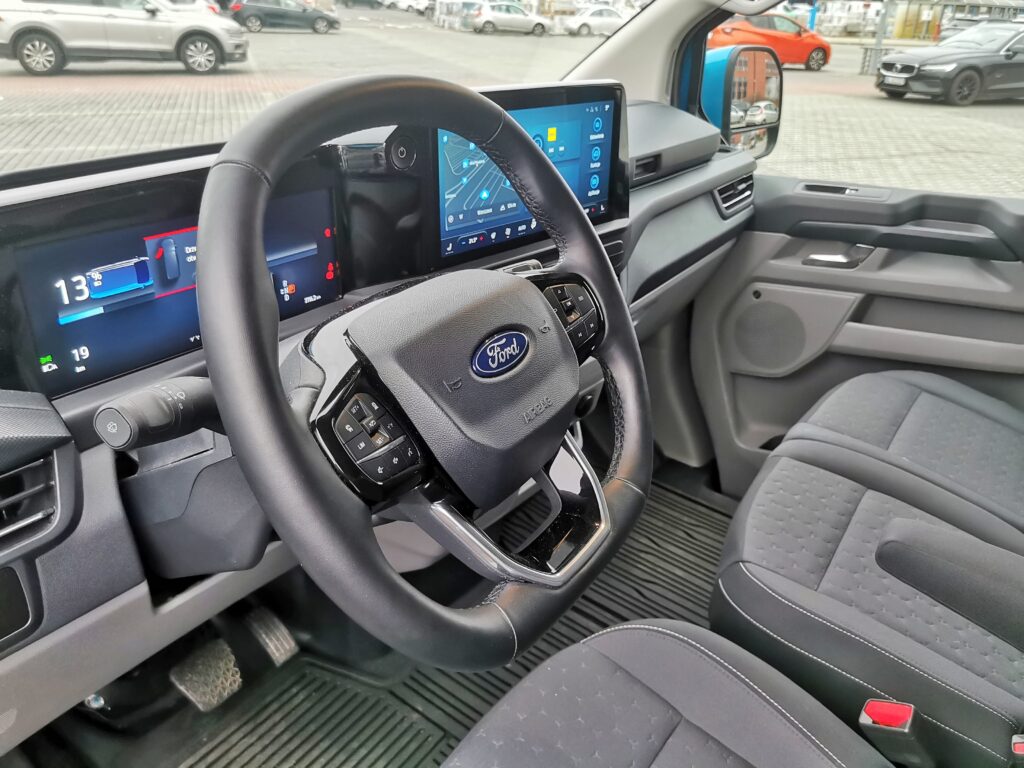 I tu dochodzimy do sedn, bowiem Ford E-Transit Custom przestał być jedynie narzędziem do codziennej logistyk, a stał się gadżetem użytkowym i wizytówką firmy. Linia boczna nadwozia oraz tylne lampy nawiązują do pierwszego Transita, ale auto jest na wskroś nowoczesne. We wnętrzu dostajemy multimedia z Apple CarPlay i Android Auto, błyskawiczne połączenie Bluetooth i ogromny ekran, dzięki któremu mapy nawigacji pozwalają zorientować się w przestrzeni miejskiej, a nie jedynie w obrębie kilku najbliższych ulic. Do tego egzemplarz testowy dostał efektowne nagłośnienie B&O. To auto idealne dla aktywnego kuriera, ale sprawdzi się także w nowoczesnej piekarni lub kwiaciarni, trendującej restauracji czy firmie cateringowej. Słowem jest doskonałym wyborem do małego biznesu, który chce się wyróżnić, a nie zniknąć w tłumie.