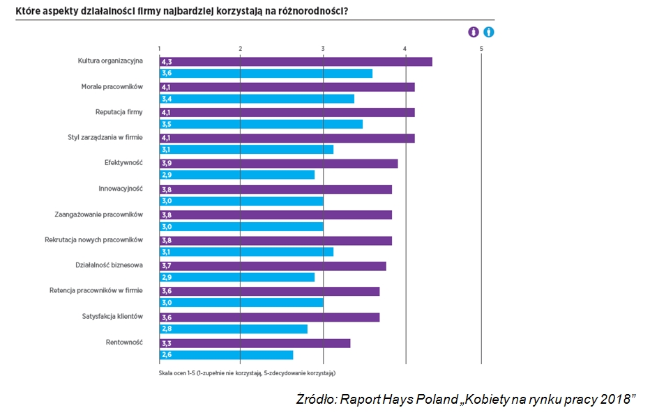 Różnorodność w firmie pozytywnie wpływa na kulturę organizacyjną, morale pracowników, reputację organizacji oraz styl zarządzania. – Różnorodność pozwala firmie patrzeć na świat z różnych perspektyw, a dzięki temu lepiej rozumieć klientów, otoczenie biznesowe, decyzje innych. Na różnorodności korzysta także efektywność, innowacyjność oraz zaangażowanie pracowników wyjaśnia – Paula Rejmer, dyrektor w Hays Poland. – Czerpiąc z doświadczeń innych, uczymy się nowych sposobów patrzenia na świat i poszerzamy swoje horyzonty, co przekłada się na proponowanie lepszych rozwiązań. W świecie dynamicznych zmian kluczem do sukcesu jest elastyczność i innowacyjność, a te zapewniane są przez różne perspektywy patrzenia na biznes i pojawiające się wyzwania – dodaje.