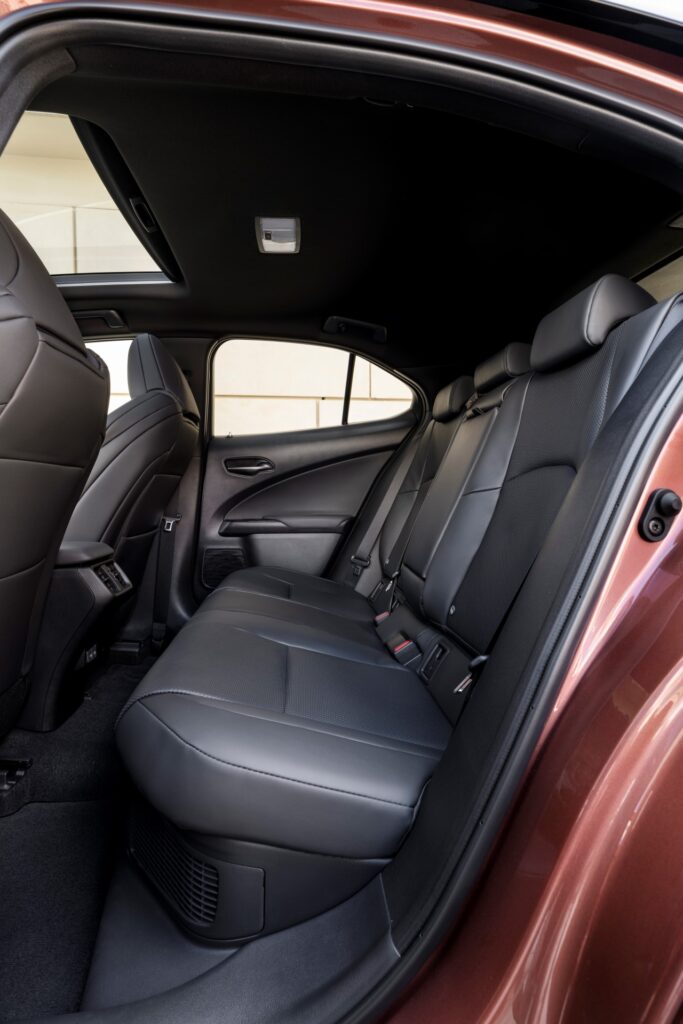 Jeśli chodzi o ilość miejsca w kabinie, to Lexus wymyślił to sobie bardzo sprytnie i dał pasażerom dokładnie tyle miejsca, ile potrzeba i nic ponad to. Niektórzy powiedzą, że jest ciasno, inni, że wnętrze jest szyte na miarę. Rzeczywiście z przodu będzie wygodnie nawet wysokiemu kierowcy i pasażerowi. Jeśli chcecie podróżować z tyłu, nie możecie mieć więcej niż 170 cm wzrostu. Nie zapominajmy, że Lexus UX jest miejskim crossoverem, a więc idealnie będzie podróżować nim w konfiguracji dwoje dorosłych i dwoje niezbyt wyrośniętych dzieci, choć pociechy mogą być nieco zawiedzione brakiem jakichkolwiek schowków na niezbędne drobiazgi i skarby. Projektanci zapomnieli o kieszeniach w drzwiach i tej w fotelu kierowcy. Prawdopodobnie na sekundę przed zatwierdzeniem projektu ktoś dorysował kieszeń za fotelem pasażera. Jest więc jedna do podziału.