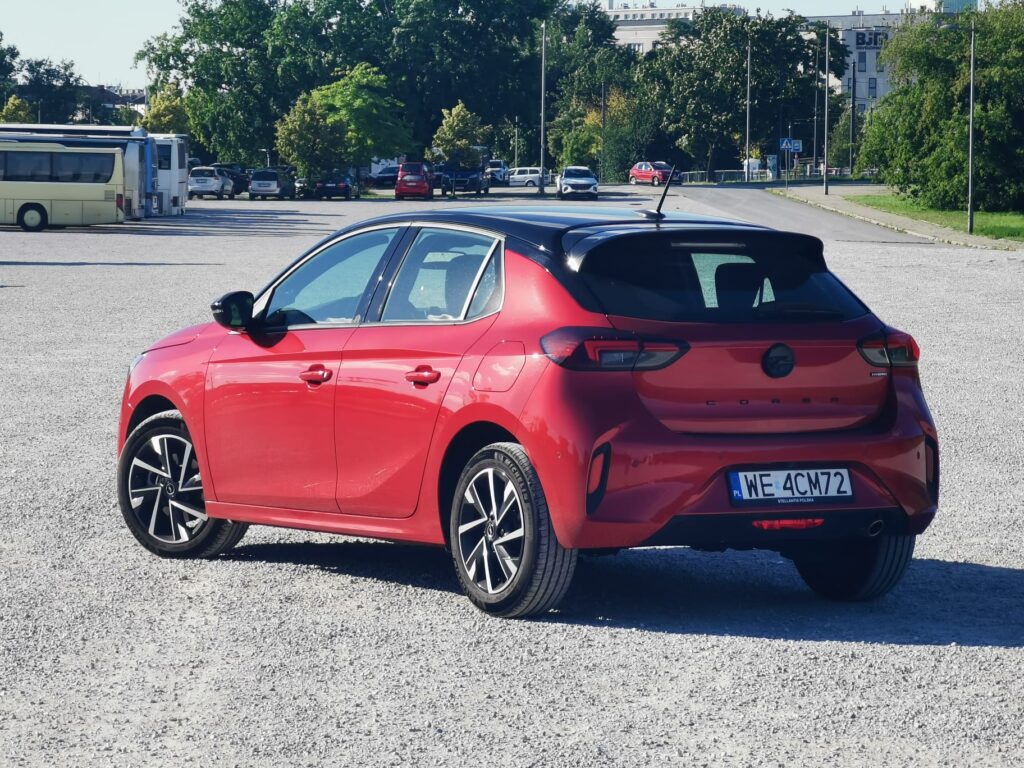 Najnowsza Corsa oferuje wiele rozwiązań technicznych i dodatków zwiększających komfort i bezpieczeństwo. Systemy wspomagające obejmują na przykład system ostrzegania przed najechaniem na pojazd poprzedzający, tempomat z ograniczeniem prędkości, asystenta pasa ruchu i rozpoznawanie znaków ograniczenia prędkości. Dostępny jest także układ wykrywania pieszych i system wykrywający zmęczenie kierowcy. Można zatem zaryzykować stwierdzenie, że na pokładzie znajduje się komplet rozwiązań niezbędnych do bezpiecznego poruszania się po zatłoczonych miastach. Wyposażenie uzupełniają: klimatyzacja automatyczna, system multimedialny z 7-calowym ekranem dotykowym czy dzielona tylna kanapa. Szczególnie atrakcyjnie prezentują się egzemplarze w opcji dwukolorowego malowania, gdzie burgundowy metallic świetnie współgra z czarnym dachem, słupkami i 16-calowymi felgami. Auto wygląda dynamicznie, a linia nadwozia ma w sobie dużo sportowych cech.