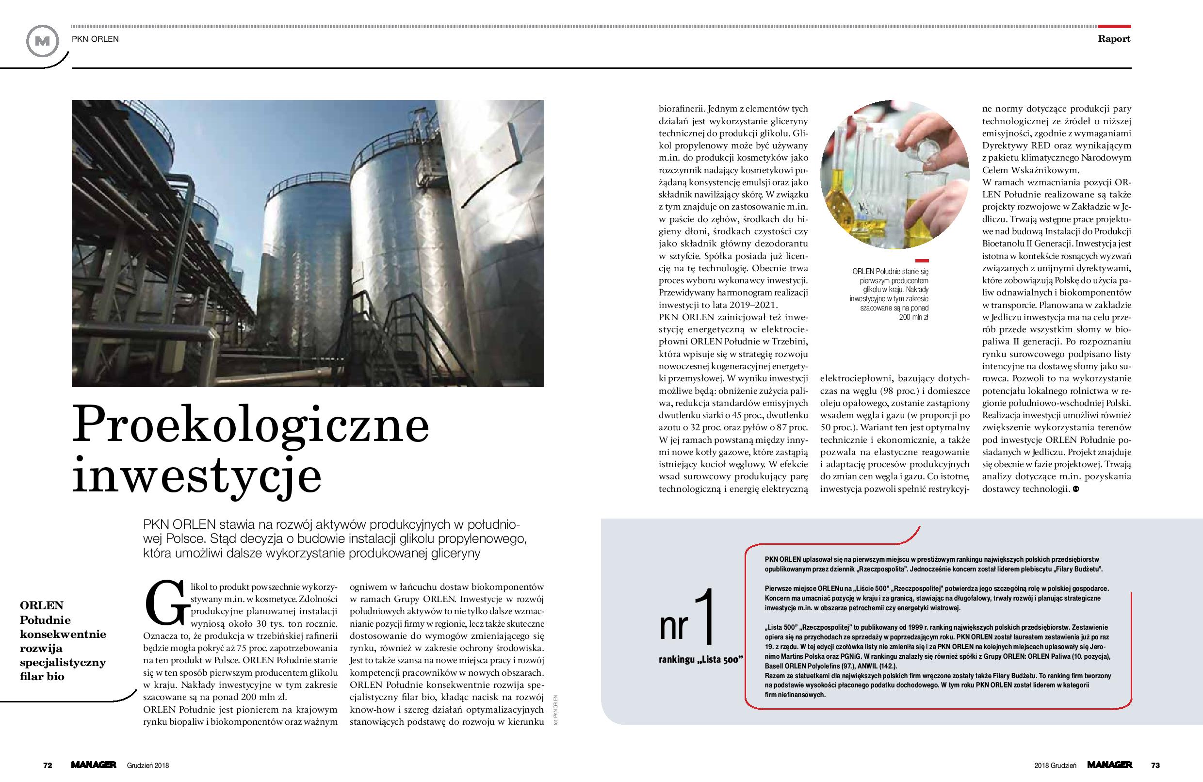 ORLEN Południe stanie się pierwszym producentem glikolu w kraju. Nakłady inwestycyjne w tym zakresie szacowane są na ponad 200 mln zł.