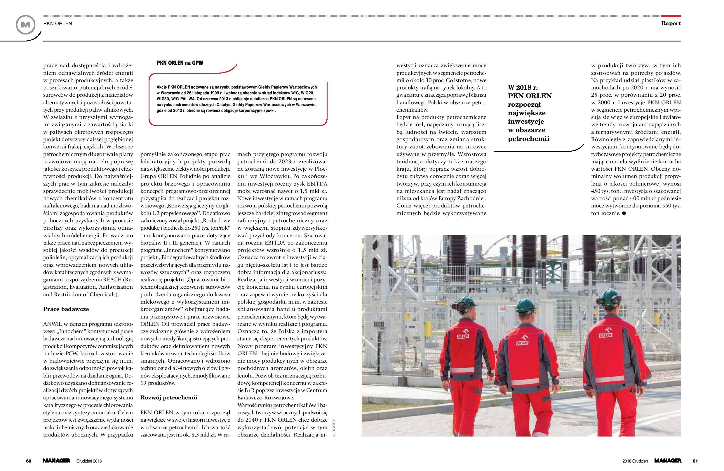 PKN ORLEN w tym roku rozpoczął największe w swojej historii inwestycje w obszarze petrochemii. Ich wartość szacowana jest na ok. 8,3 mld zł. W ramach przyjętego programu rozwoju petrochemii do 2023 r. zrealizowane zostaną nowe inwestycje w Płocku i we Włocławku. Po zakończeniu inwestycji roczny zysk EBITDA może wzrosnąć nawet o 1,5 mld zł.