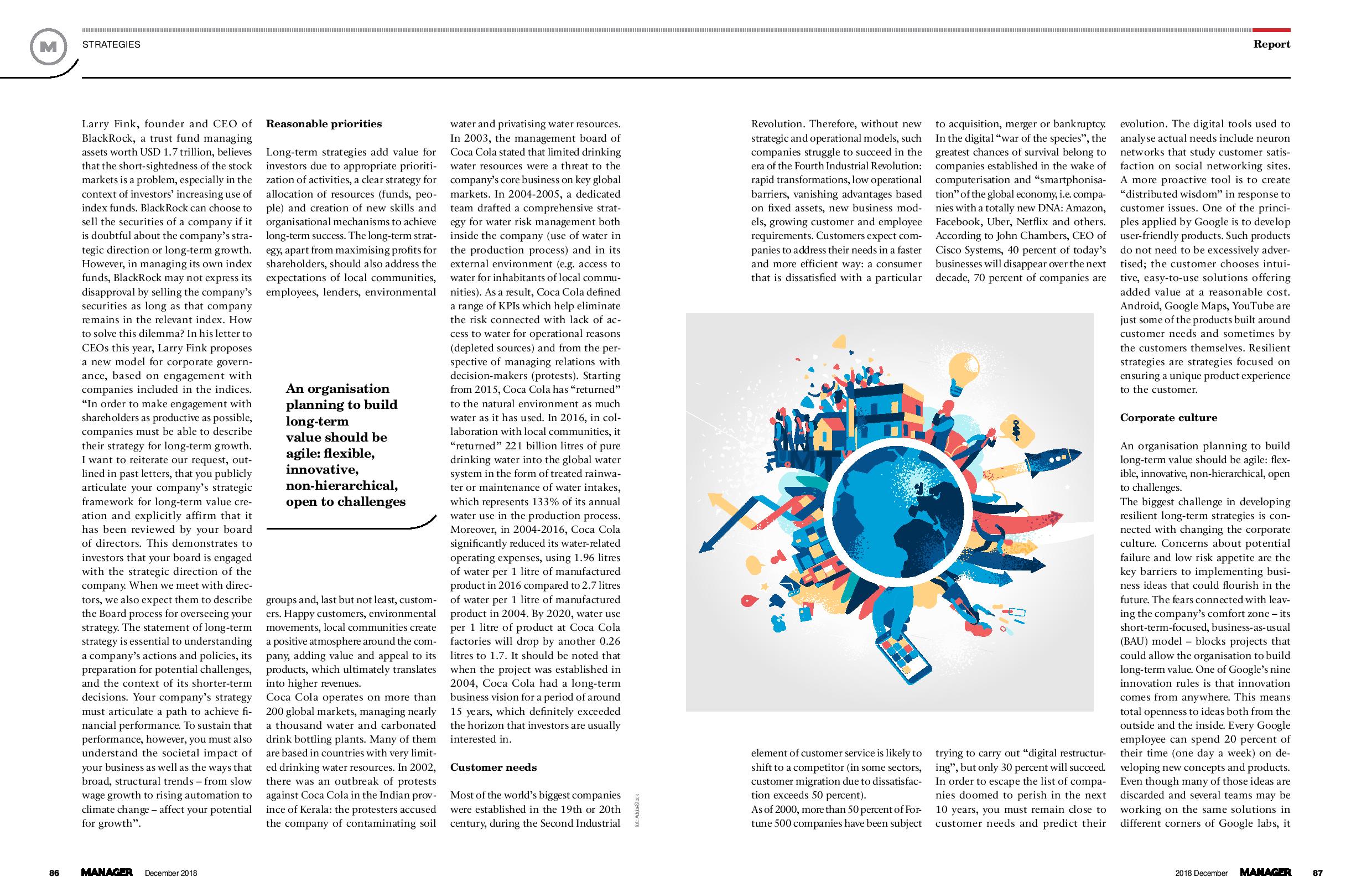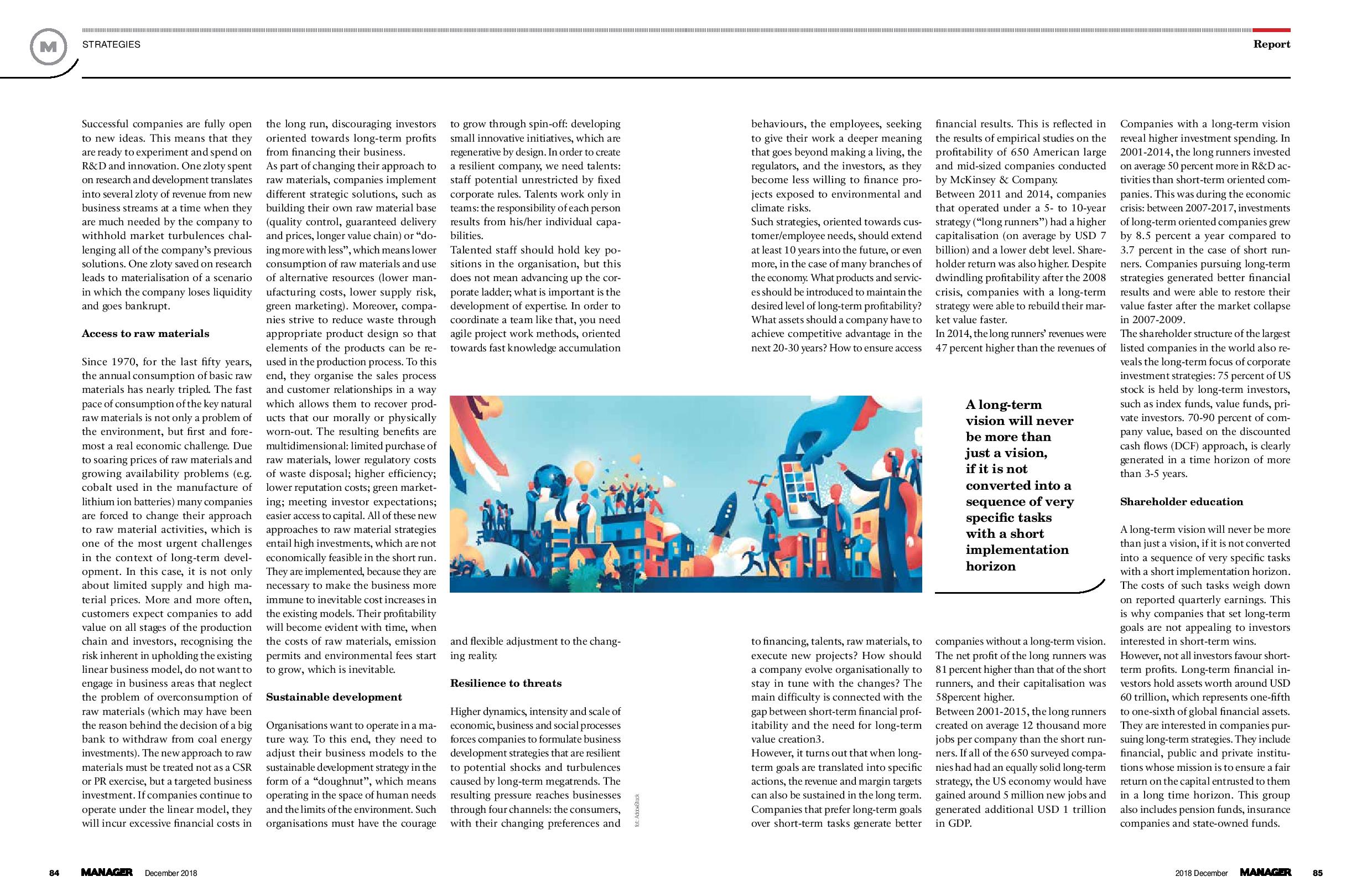 Such strategies, oriented towards customer/employee needs, should extend at least 10 years into the future, or even more, in the case of many branches of the economy. What products and services should be introduced to maintain the desired level of long-term profitability? What assets should a company have to achieve competitive advantage in the next 20-30 years? How to ensure access to financing, talents, raw materials, to execute new projects? How should a company evolve organisationally to stay in tune with the changes? The main difficulty is connected with the gap between short-term financial profitability and the need for long-term value creation3.