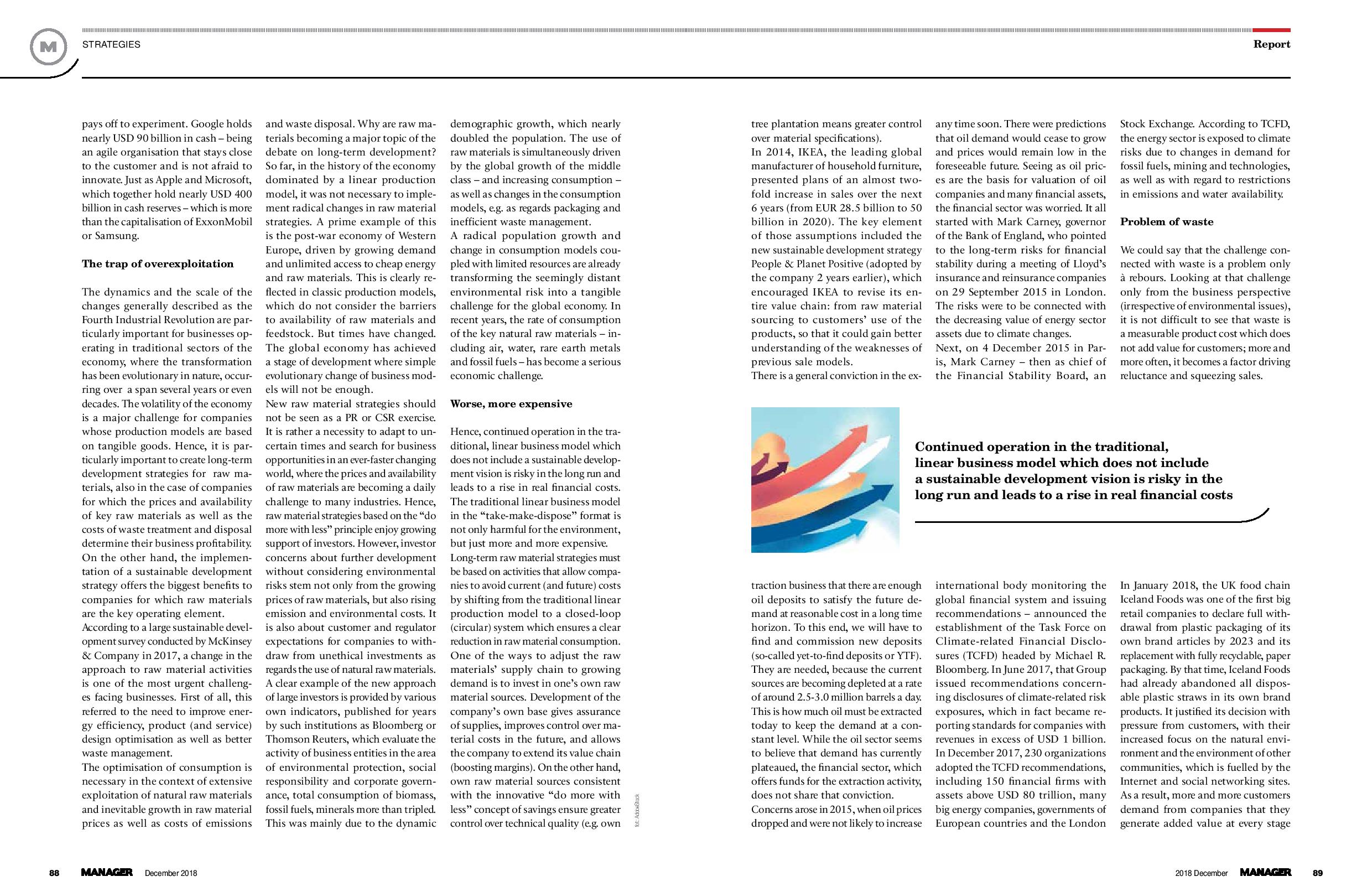 Since 1970, for the last fifty years, the annual consumption of basic raw materials has nearly tripled. The fast pace of consumption of the key natural raw materials is not only a problem of the environment, but first and foremost a real economic challenge. Due to soaring prices of raw materials and growing availability problems (e.g. cobalt used in the manufacture of lithium ion batteries) many companies are forced to change their approach to raw material activities, which is one of the most urgent challenges in the context of long-term development. In this case, it is not only about limited supply and high material prices. More and more often, customers expect companies to add value on all stages of the production chain and investors, recognising the risk inherent in upholding the existing linear business model, do not want to engage in business areas that neglect the problem of overconsumption of raw materials (which may have been the reason behind the decision of a big bank to withdraw from coal energy investments). The new approach to raw materials must be treated not as a CSR or PR exercise, but a targeted business investment. If companies continue to operate under the linear model, they will incur excessive financial costs in the long run, discouraging investors oriented towards long-term profits from financing their business.