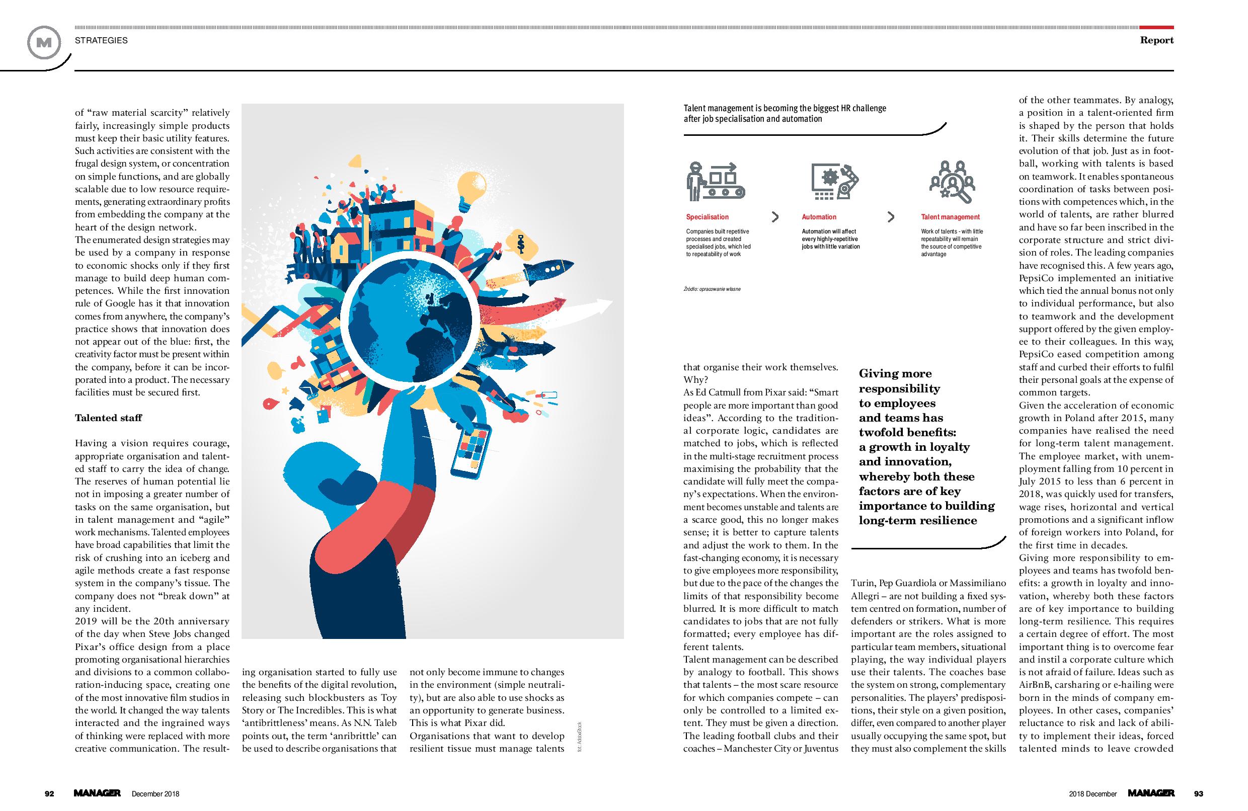 Talent management can be described by analogy to football. This shows that talents – the most scare resource for which companies compete – can only be controlled to a limited extent. They must be given a direction. The leading football clubs and their coaches – Manchester City or Juventus Turin, Pep Guardiola or Massimiliano Allegri – are not building a fixed system centred on formation, number of defenders or strikers. What is more important are the roles assigned to particular team members, situational playing, the way individual players use their talents. The coaches base the system on strong, complementary personalities. The players’ predispositions, their style on a given position, differ, even compared to another player usually occupying the same spot, but they must also complement the skills of the other teammates. By analogy, a position in a talent-oriented firm is shaped by the person that holds it. Their skills determine the future evolution of that job. Just as in football, working with talents is based on teamwork. It enables spontaneous coordination of tasks between positions with competences which, in the world of talents, are rather blurred and have so far been inscribed in the corporate structure and strict division of roles. The leading companies have recognised this. A few years ago, PepsiCo implemented an initiative which tied the annual bonus not only to individual performance, but also to teamwork and the development support offered by the given employee to their colleagues. In this way, PepsiCo eased competition among staff and curbed their efforts to fulfil their personal goals at the expense of common targets.