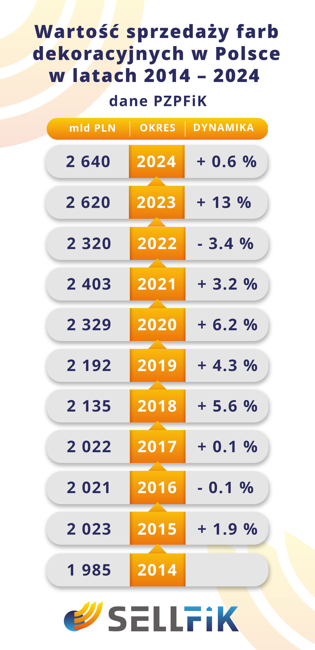 W 2024 roku branża farb dekoracyjnych – stanowiąca największy segment rynku – zanotowała niewielki wzrost wartości sprzedanych farb o 0,6% r/r do 2,64 mld PLN (w roku 2023 wzrost ten wyniósł 13%), przy jednoczesnym spadku ich wolumenu liczonego w litrach o -3,5% r/r (w 2023 r. było to -2%). Wyniki powstały na bazie raportu SellFiK przygotowanego dla Polskiego Związku Producentów Farb i Klejów.